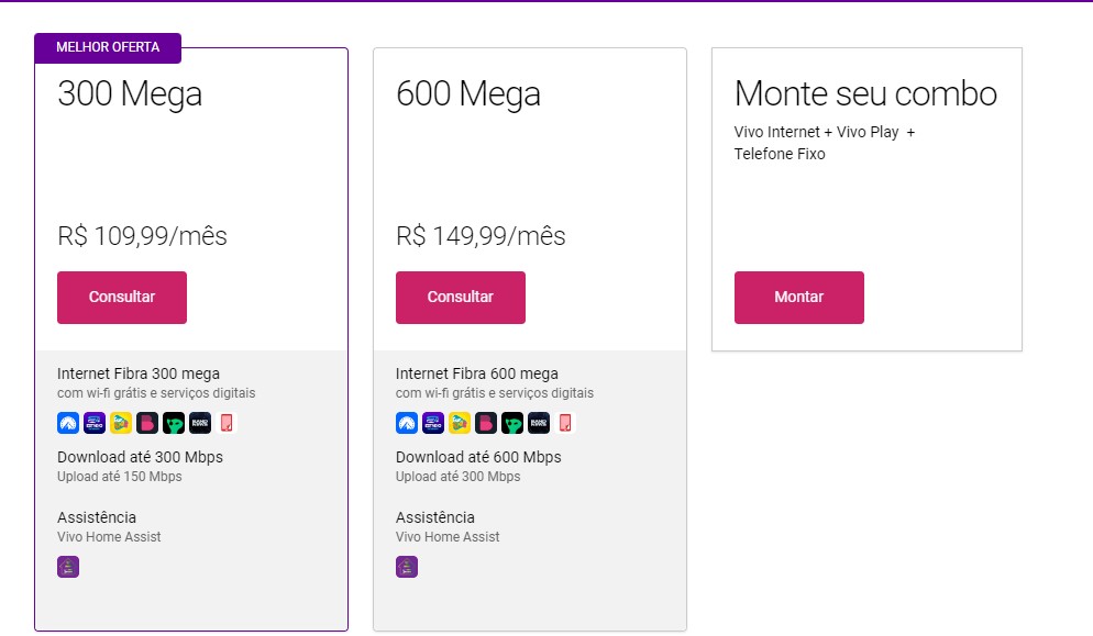 Conforme destaca em seu site, os consumidores interessados em contratar o Vivo Fibra de 600 Mbps tem à disposição inúmeros pacotes com recursos diferentes. Por também funcionar como uma hub de serviços digitais, a tele também conta com planos que incluem plataformas como Netflix ou Disney Plus com condições especiais e exclusivas.